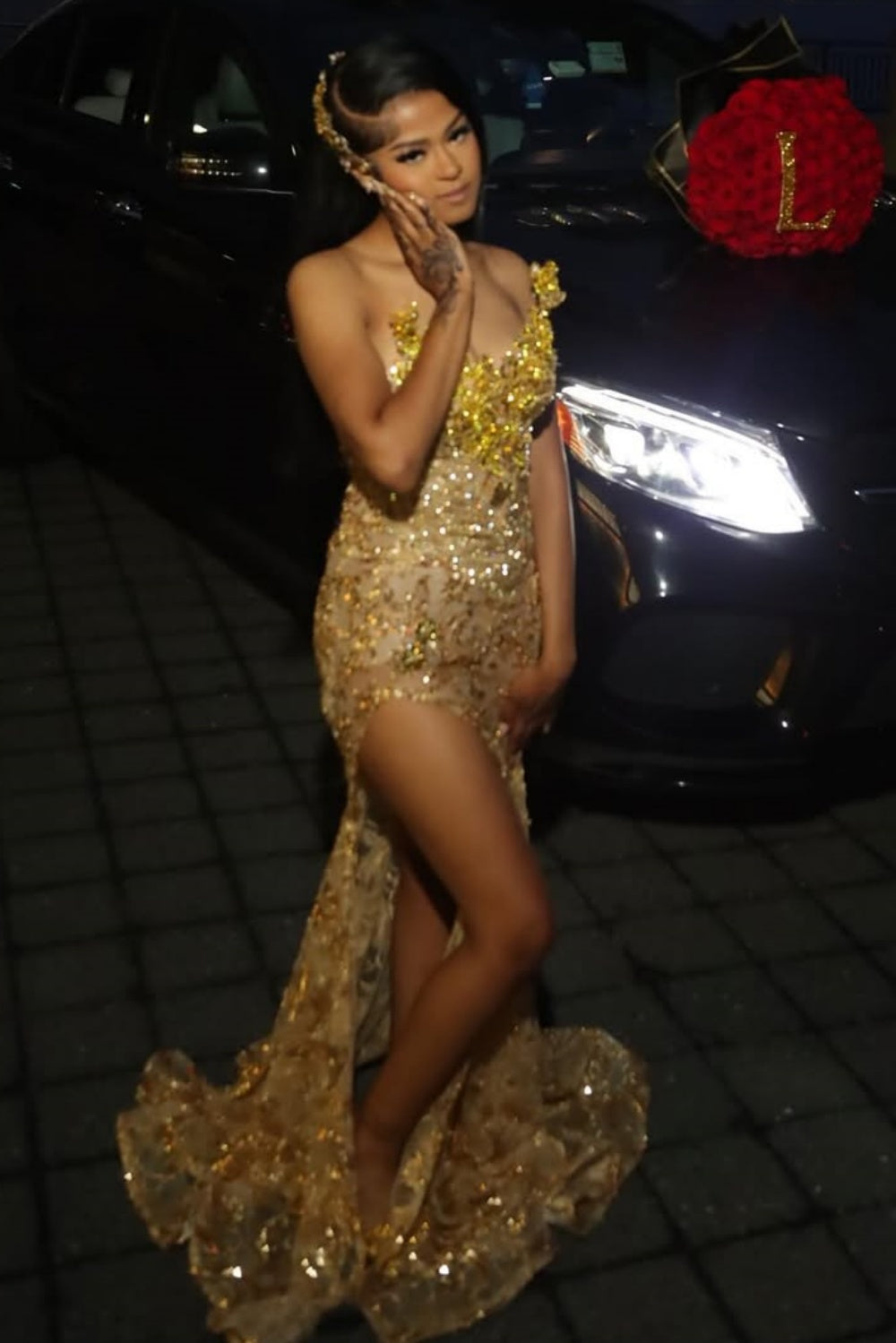 Luxury Champagne Gold Mermaid Prom Dress with Illusion Cut-outs & Dramatic Sequin Train – Custom Made for Black Girls
