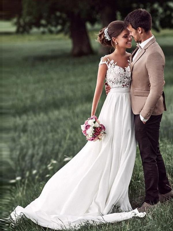 White Simple Wedding Dress White Chiffon Illusion Sleeveless Court Train Applique Sheath Bridal Gowns