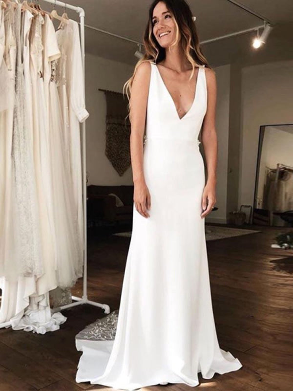 Sexy Mermaid Wedding Dress White V-Neck Backless Lace Bridal Dresses