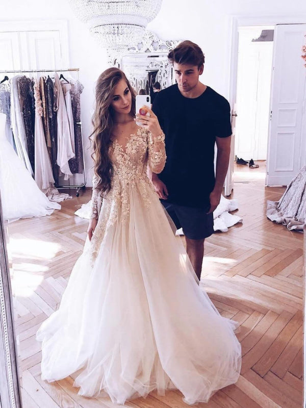 BMbridal Elegant V-neck Appliques Tulle A-line Wedding Dress On Sale