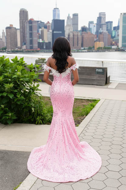 The Pink Perfection - 2026 Off-Shoulder Beaded Mermaid Gown: Blush Sequins with White Floral Appliques & Cathedral Train
