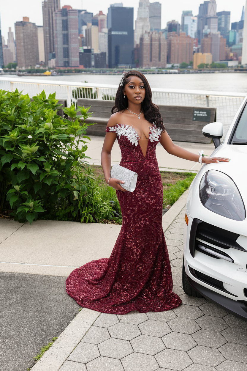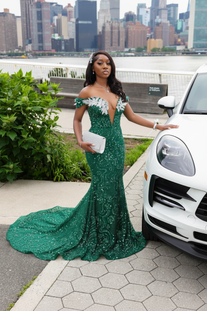 This breathtaking blush pink beaded evening gown is a showstopper designed for the modern queen who commands attention. Featuring delicate off-shoulder sleeves adorned with white floral appliqu??s, thousands of hand-placed sequins, and a dramatic cathedral train, this dress is pure luxury and romance combined.