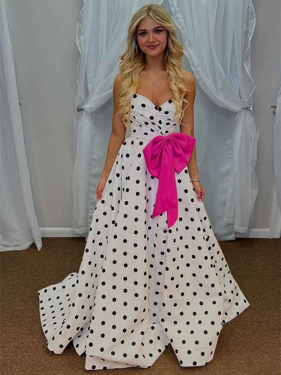 Sweetheart Dot Satin Long Prom Dress with Bow