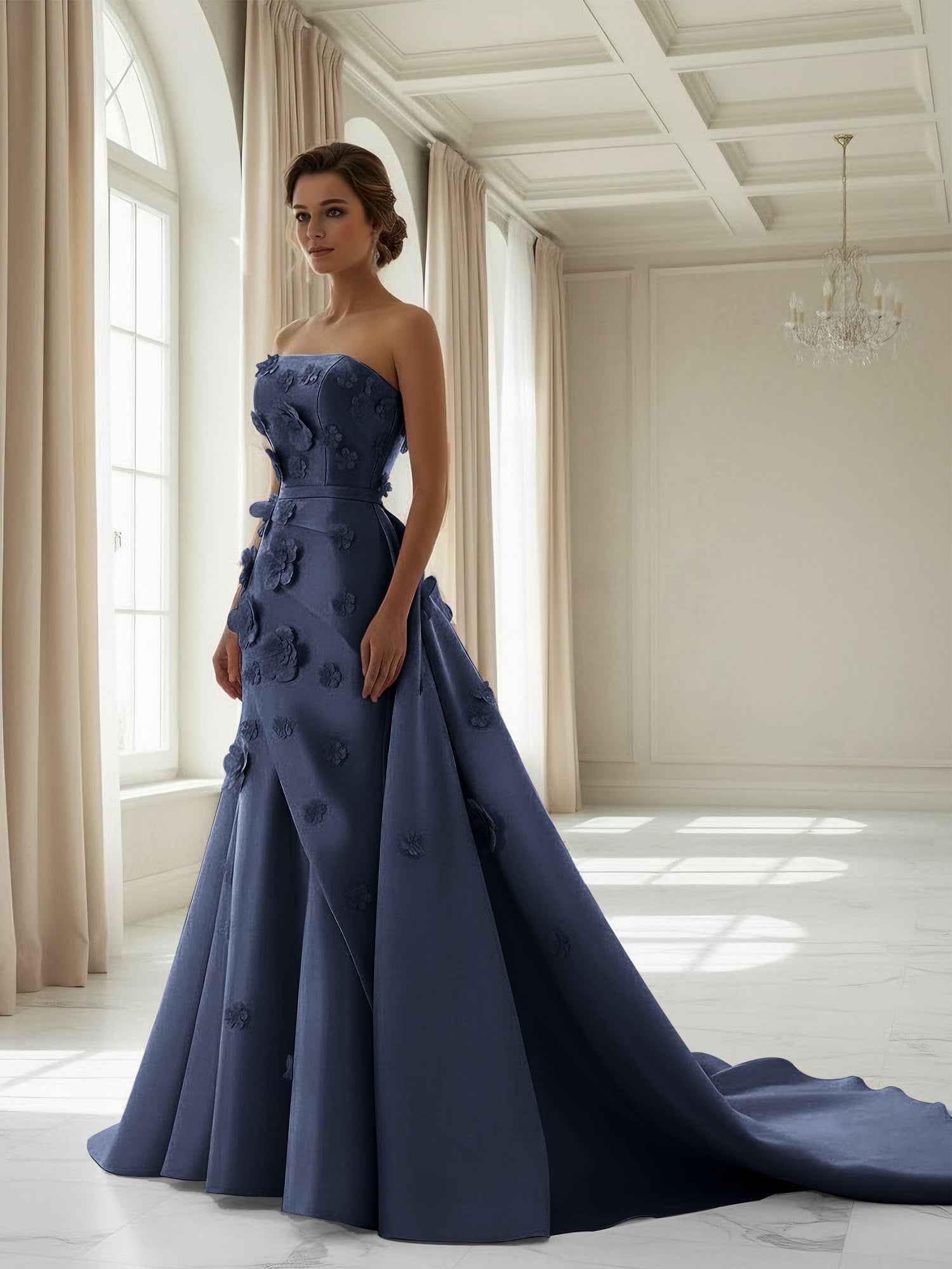Glamorous Navy Blue Sequin Strapless Mermaid Prom Dress with Choker
