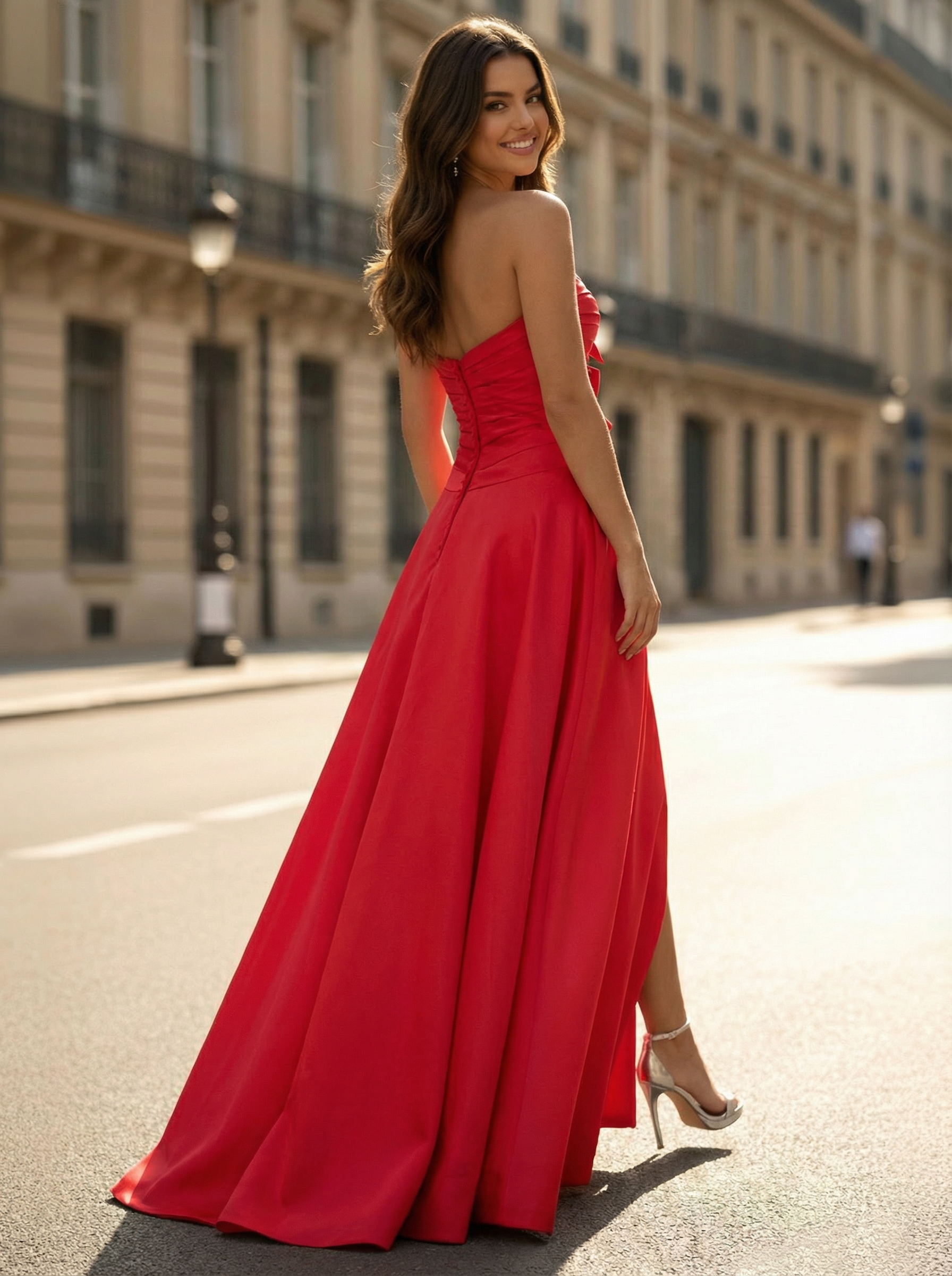 Make a bold and romantic statement in this breathtaking red prom gown, designed to turn heads with its vibrant color and unique structural details. The bodice features a strapless sweetheart neckline accented by three charming bows down the center, creating playful yet sophisticated peek-a-boo cutouts. Crafted from lustrous satin, the A-line skirt drapes beautifully from the waist, featuring a daring high leg slit that adds a touch of modern allure to the classic silhouette. The back creates a clean, elegant line with a concealed zipper closure. Perfect for proms, red carpet events, or formal galas, this gown balances timeless glamour with a spirited edge, ensuring you feel unforgettable all night long.