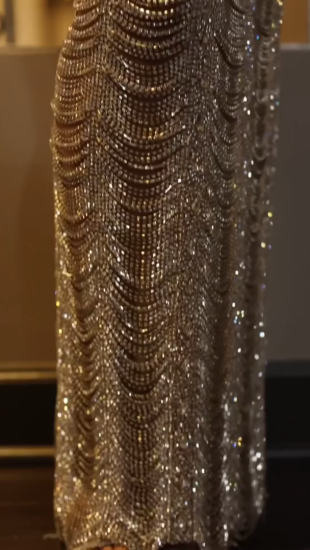 - All-Over Pink Crystal Beadwork: Thousands of pink crystals and sequins create intricate scalloped wave patterns and luxurious shimmer