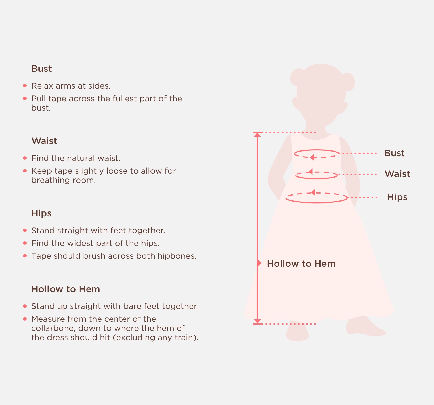 4. Measure your Hollow to Floor: Stand up straight with bare feet together. Measure from the center of the collarbone, down to where the hem of the dress shoulder hit (excluding any train).