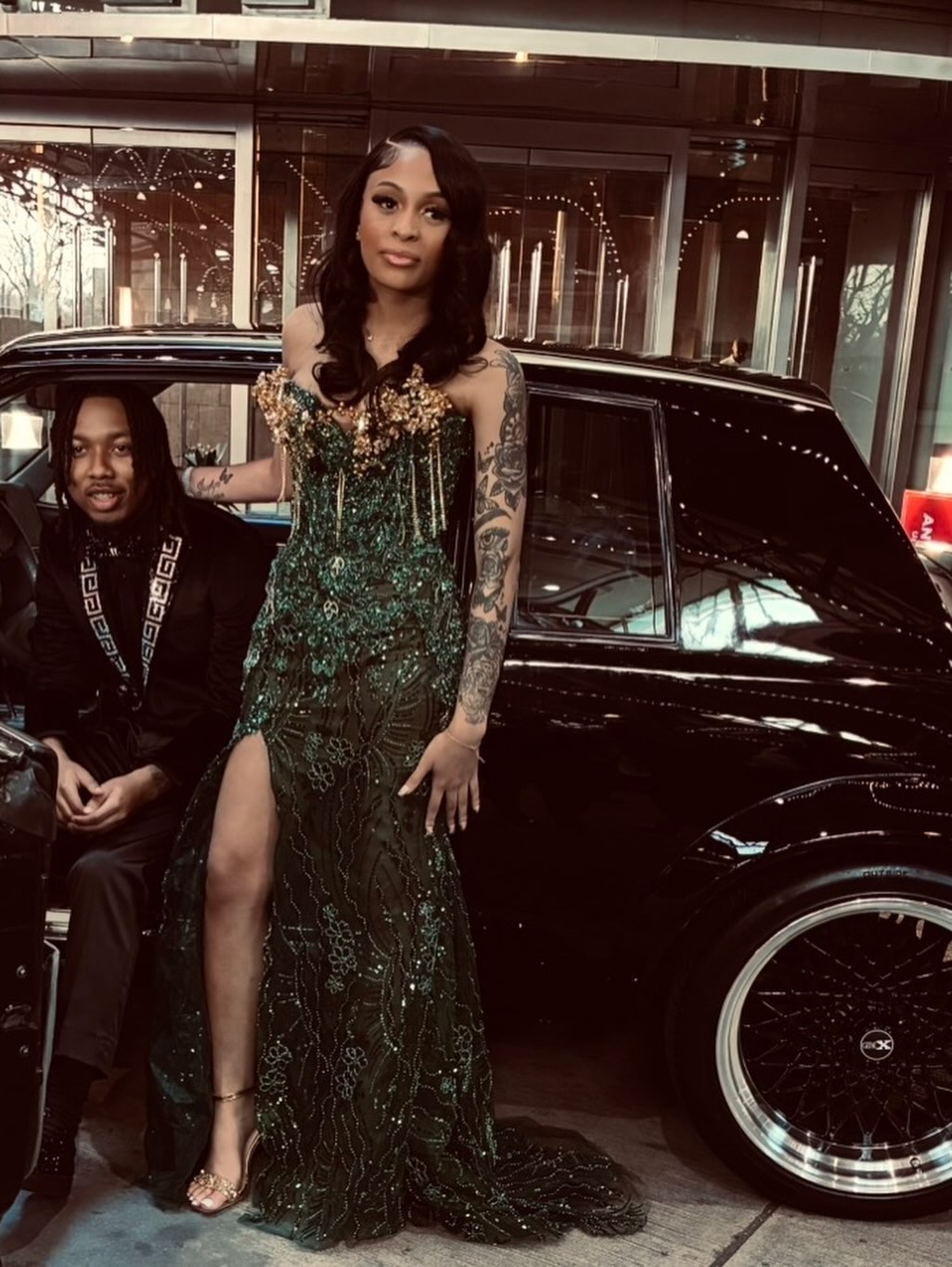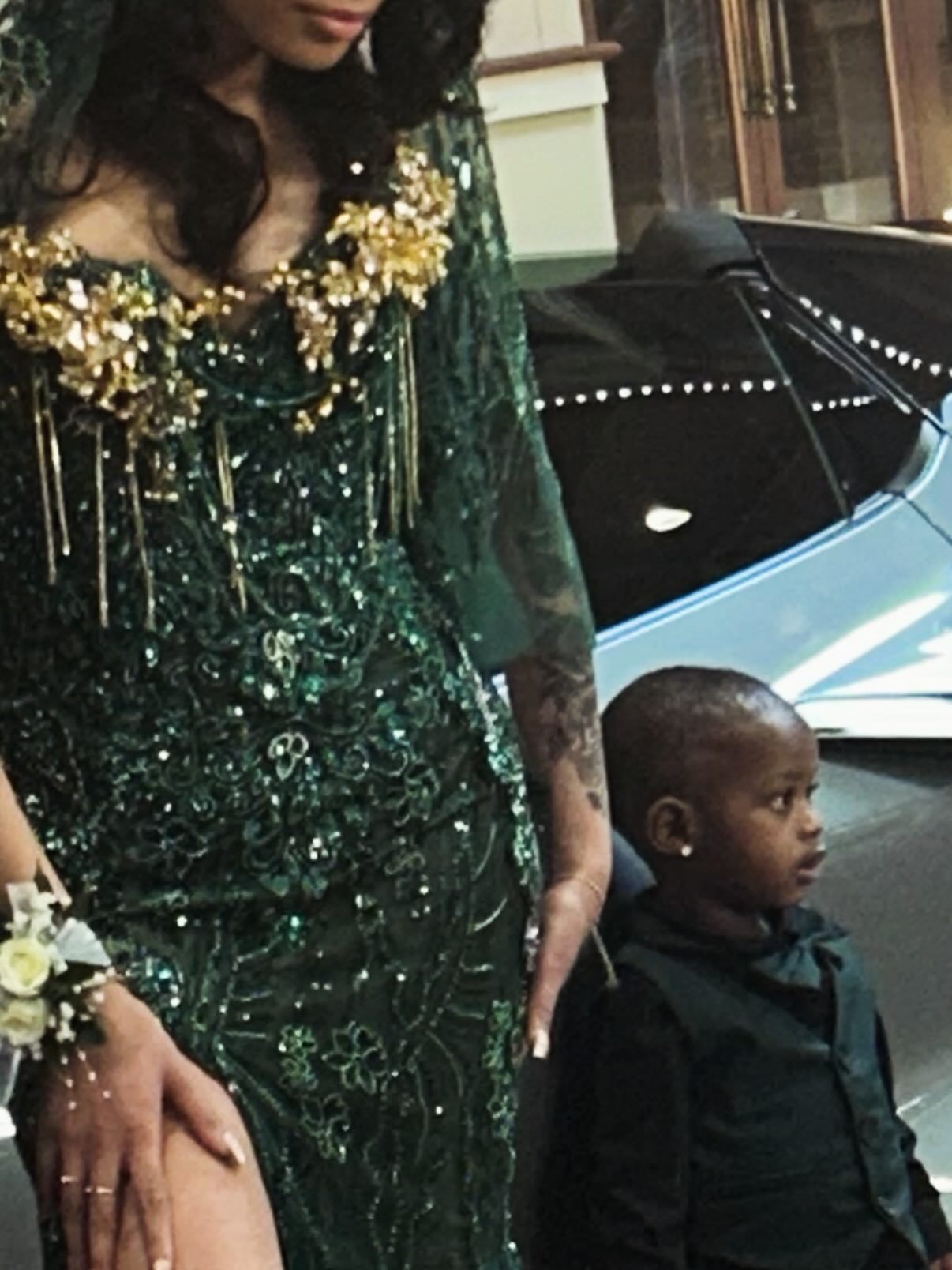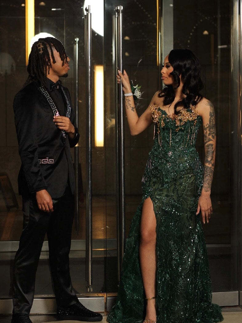 • Gold Contrast Drama: The gold tassel bodice against the deep green creates a regal, high-fashion contrast that photographs BEAUTIFULLY